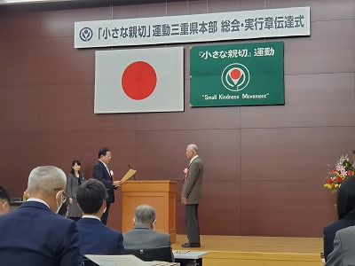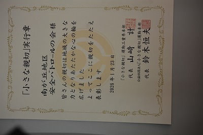 南が丘地区安全パトロールの会が第81回「小さな親切」運動三重県本部実行章をいただきました。今年度は個人表彰9名 団体表彰8団体で団体表彰8団体のうちの1つに選ばれました。