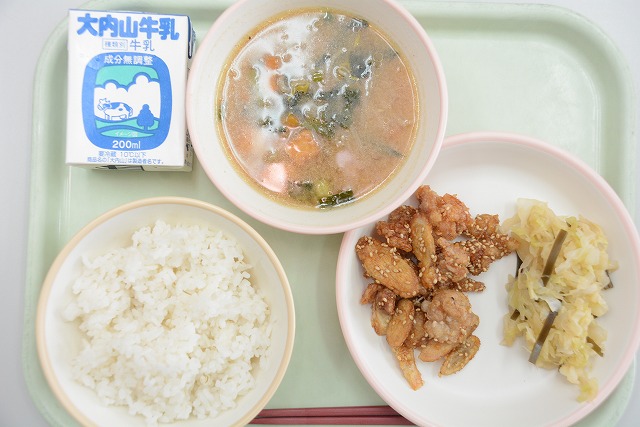 【給食】牛乳 ご飯 とりごぼう 白味噌汁 風味漬