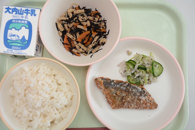 【給食】ご飯 牛乳 さわら ひじき シソあえ