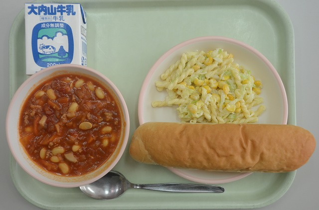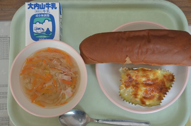 【給食】黒糖パン 牛乳 野菜スープ グラタン