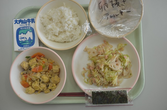 【給食】ご飯 牛乳 のり れんこんのあえもの 卵とじ