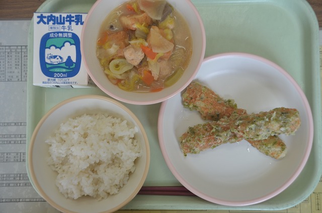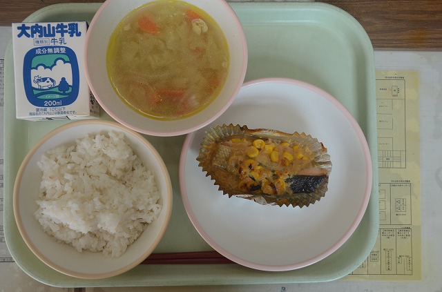 【給食】ご飯 牛乳 さけのカップ焼き ポトフ