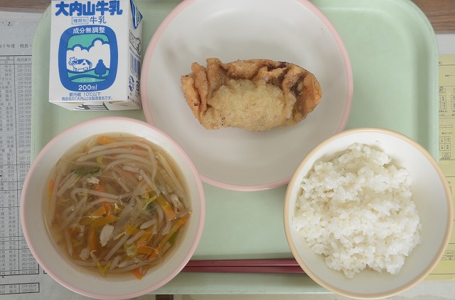 【給食】ご飯 牛乳 野菜スープ から揚げ 中華和え