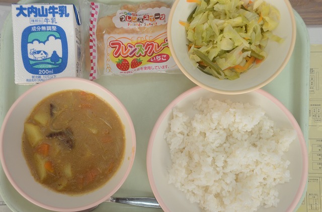【給食】ご飯 牛乳 カレーライス 茎わかめのサラダ クレープ