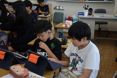 【高学年】グループごとに学習したフレーズを使って会話を練習しています。