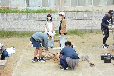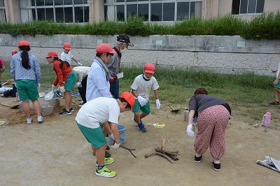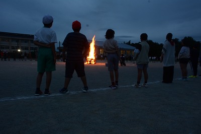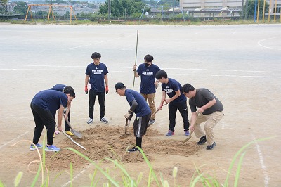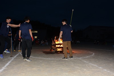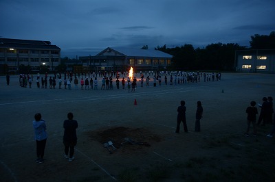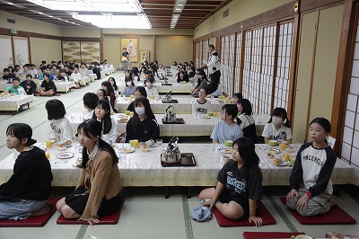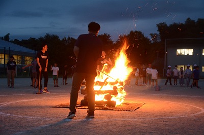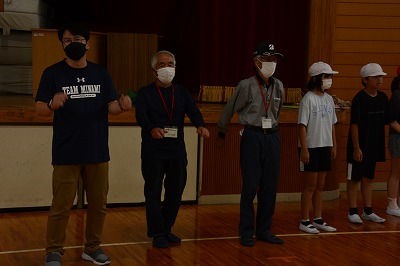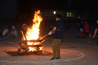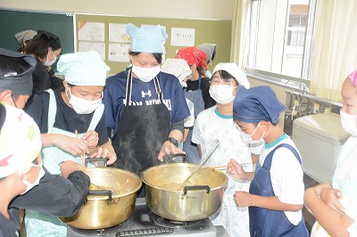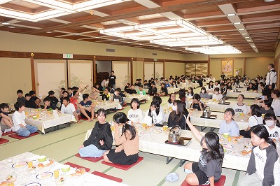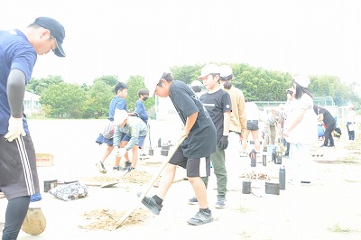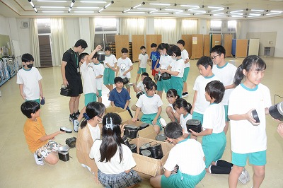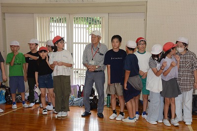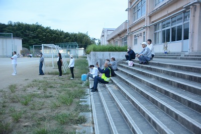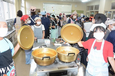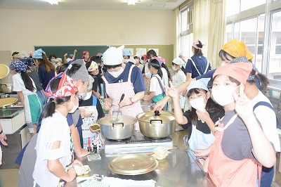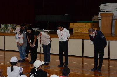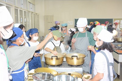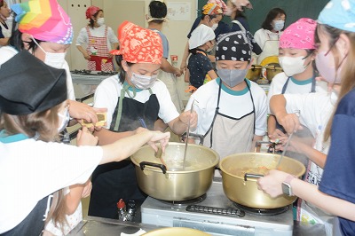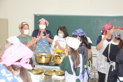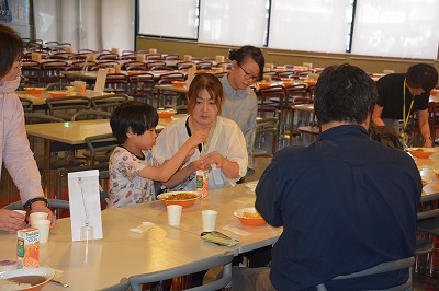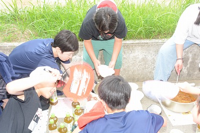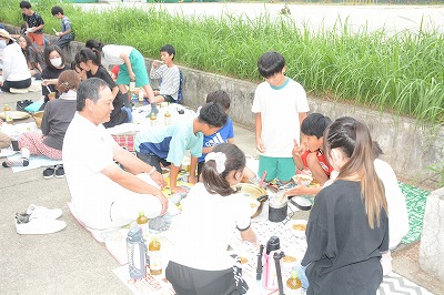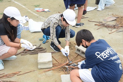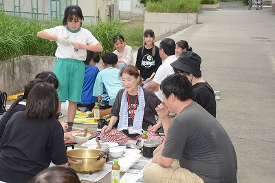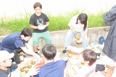 体育館でボランティアの方を紹介させていただいたあと、飯盒炊爨・カレー作りをボランティアの方に手伝っていただきながら行いました。