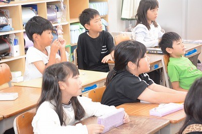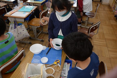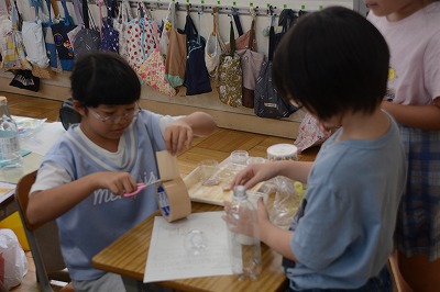 2本のペットボトルを見せてどちらがどれだけ多く入るかを予想しました。