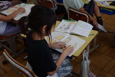 ◇算数 今日は直角の学習をしました。タブレットで学習するだけでなく、ハサミで切ったり、折ったりして手を動かしながら学習することで理解が深まることもあります。