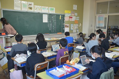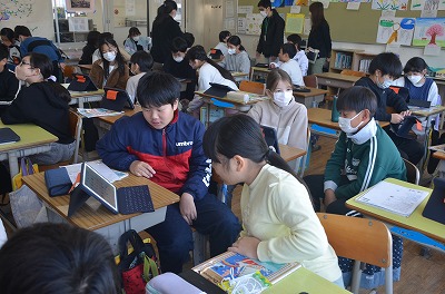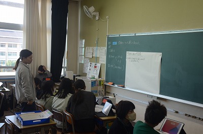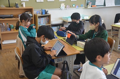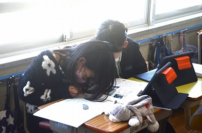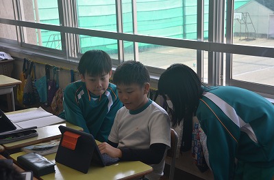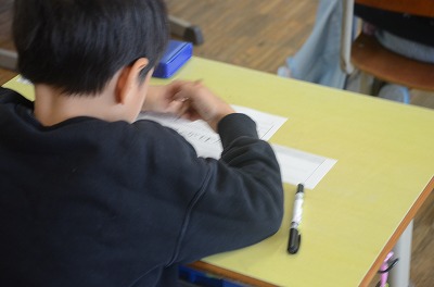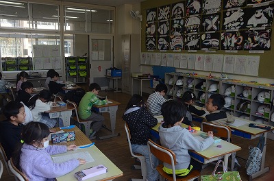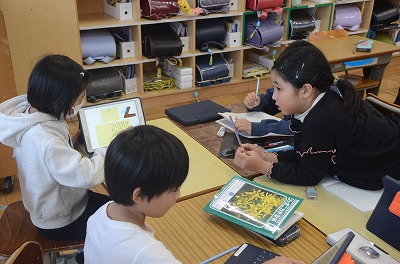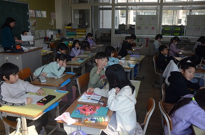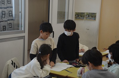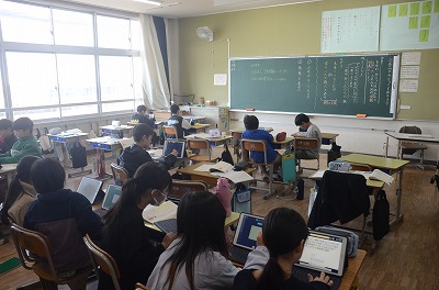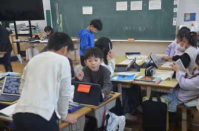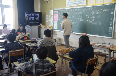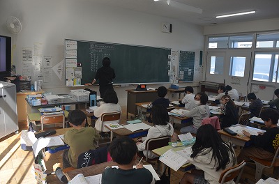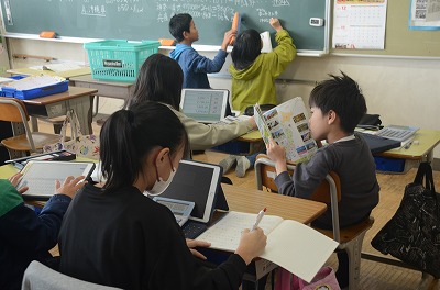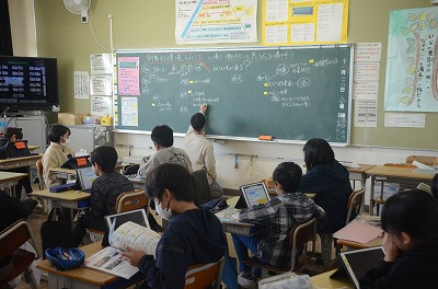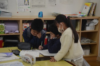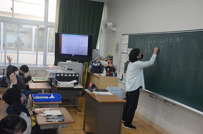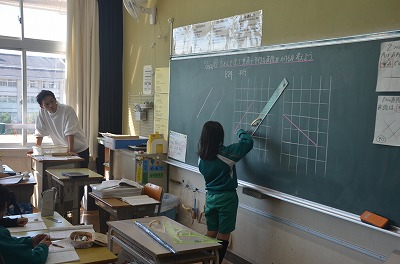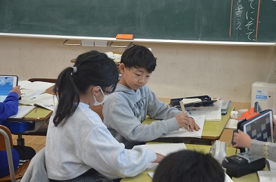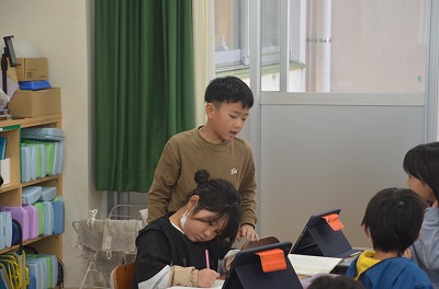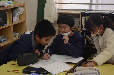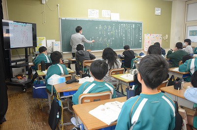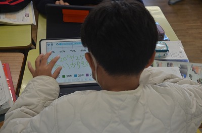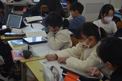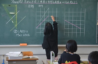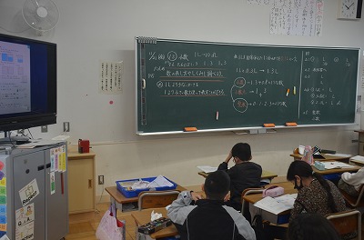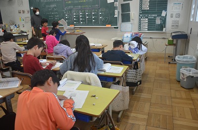 ◇算数 難しい問題を子どもたちは様々な方法で協力しあって学習しています。この時間は職員にも公開されており、たくさんのメンバーが授業を参観にきました。子どもたちは真剣な表情で学習をすすめています。