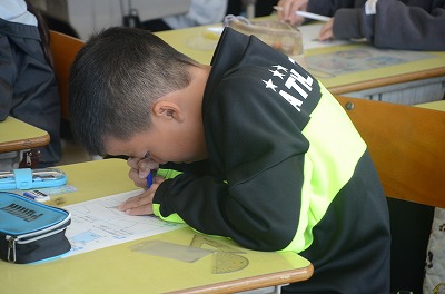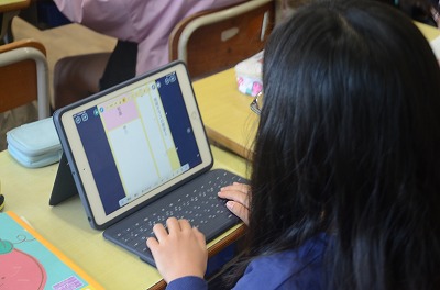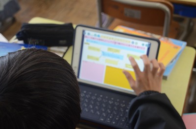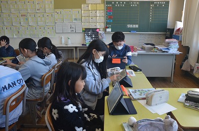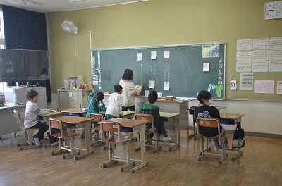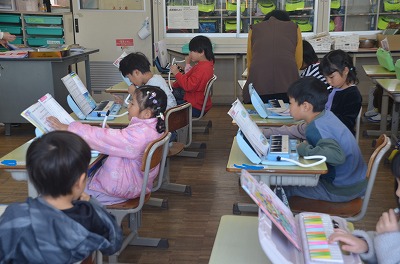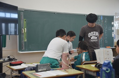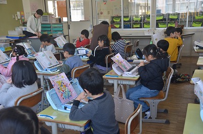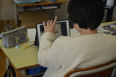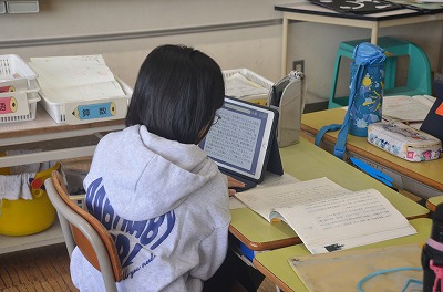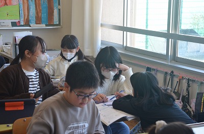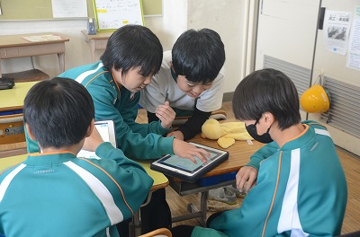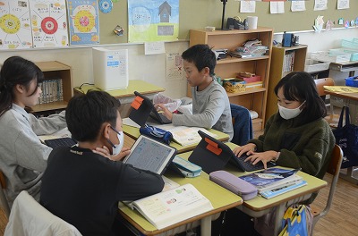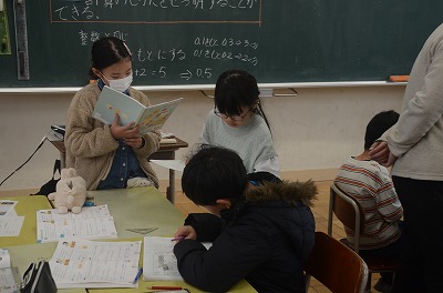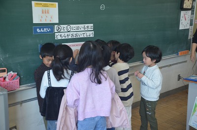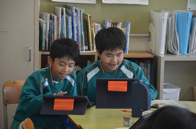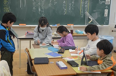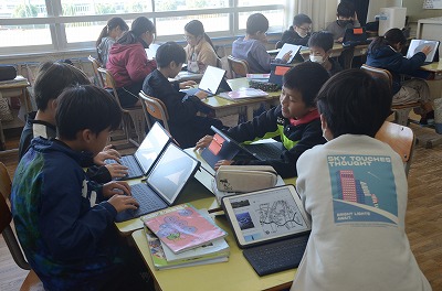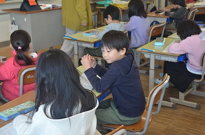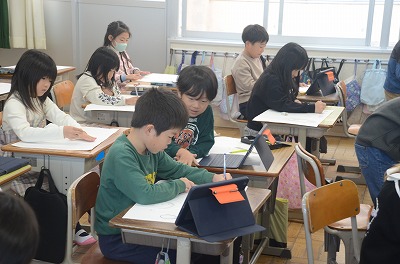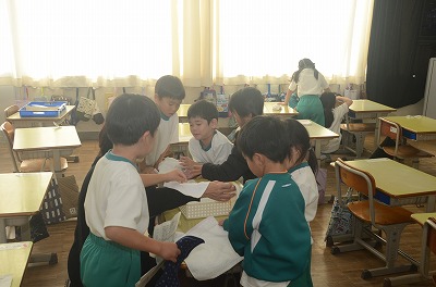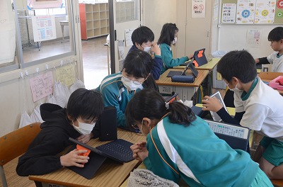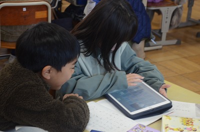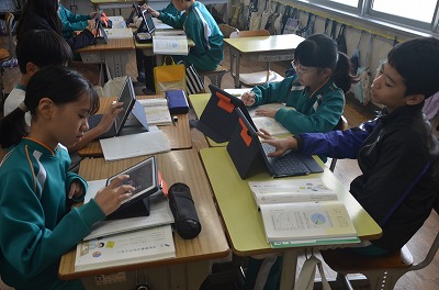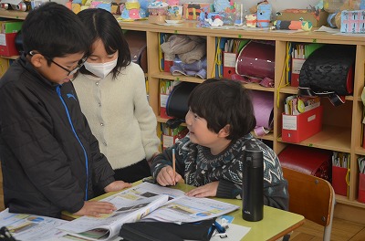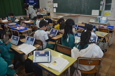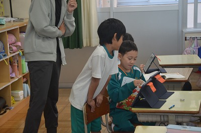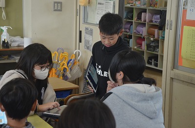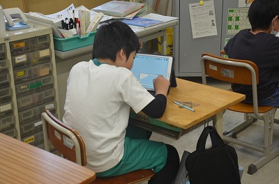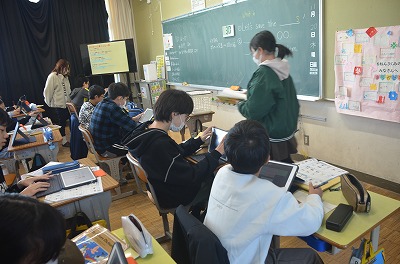 ◇算数 難しい問題を子どもたちは様々な方法で協力しあって学習しています。この時間は職員にも公開されており、たくさんのメンバーが授業を参観にきました。子どもたちは真剣な表情で学習をすすめています。