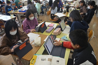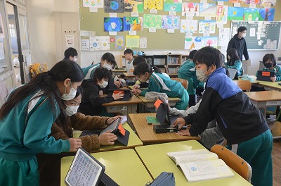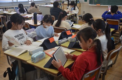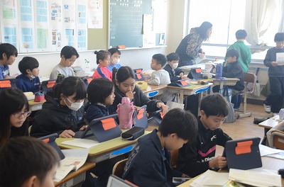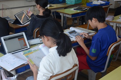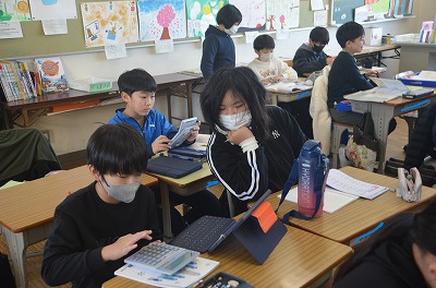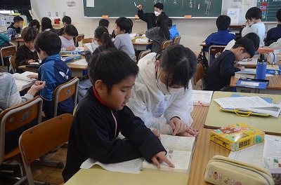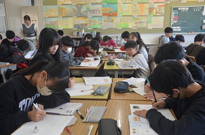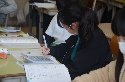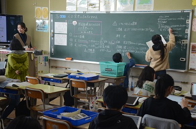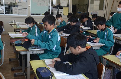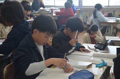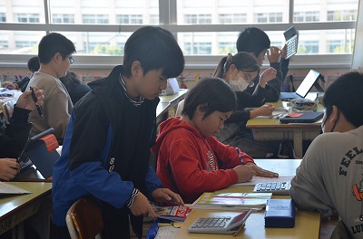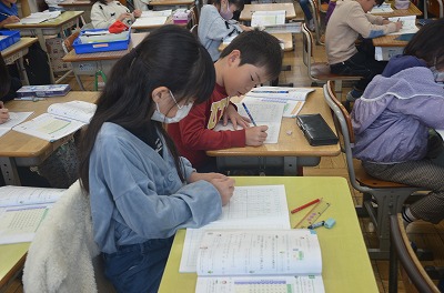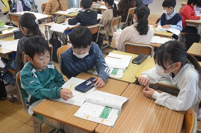 教科書の問題でこみ具合の求め方を学習した後、社会科の資料集を出し、各国の人口密度を計算しました。「ぼくは〇〇の国を調べるよ」「津市の人口密度と同じくらいだね」など計算をしながら気が付いたことをつぶやく児童もいました。