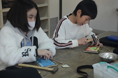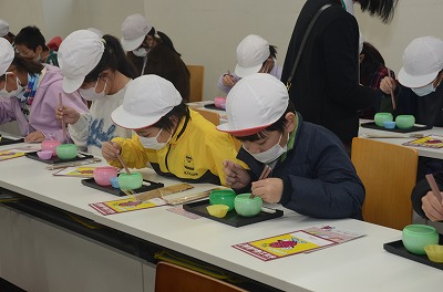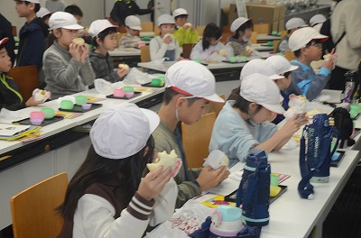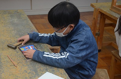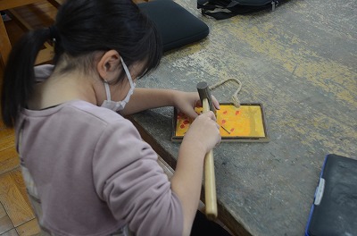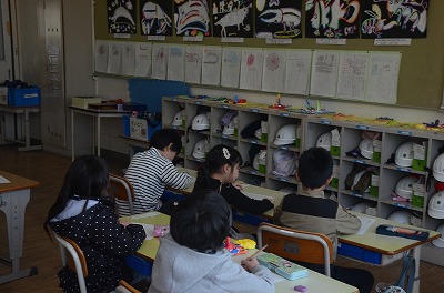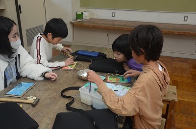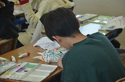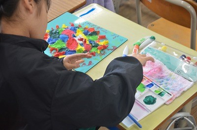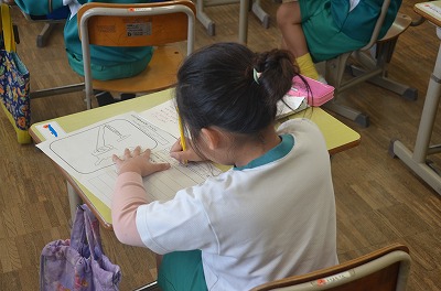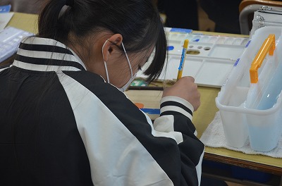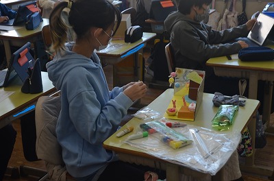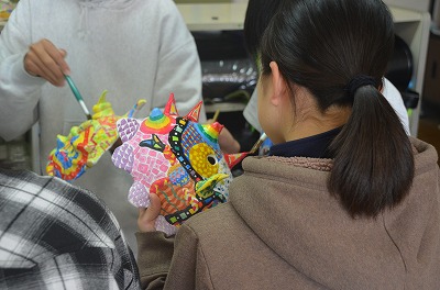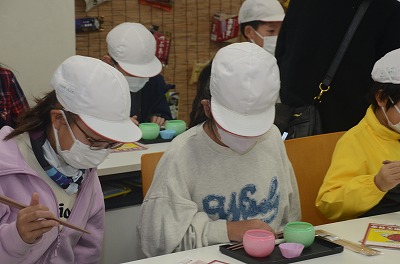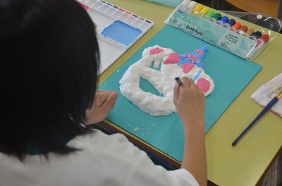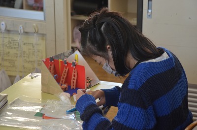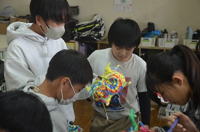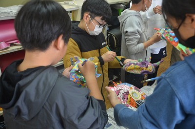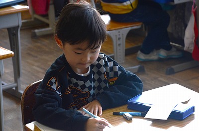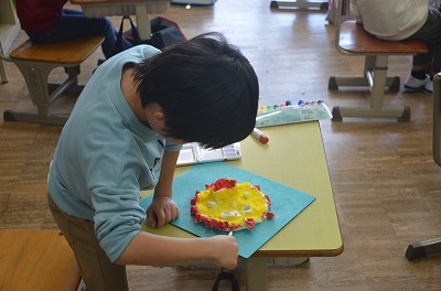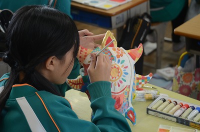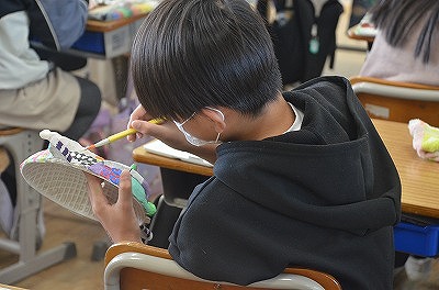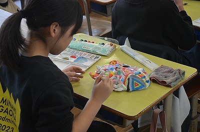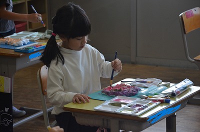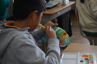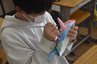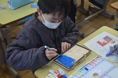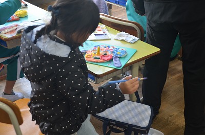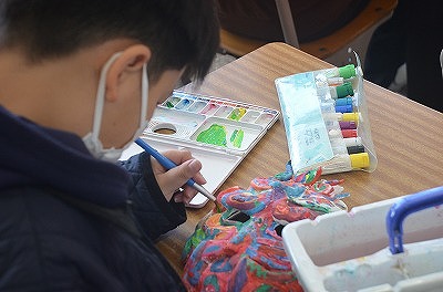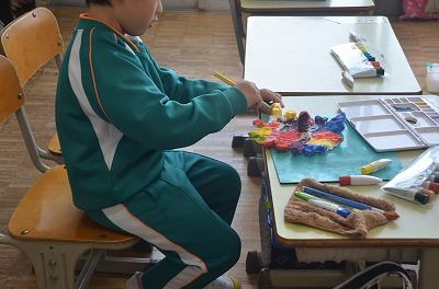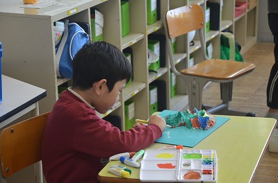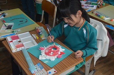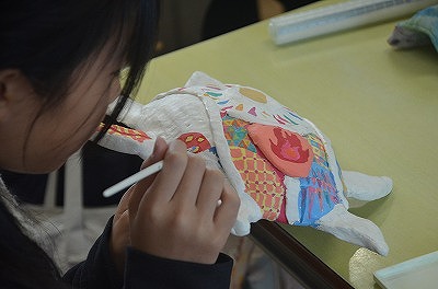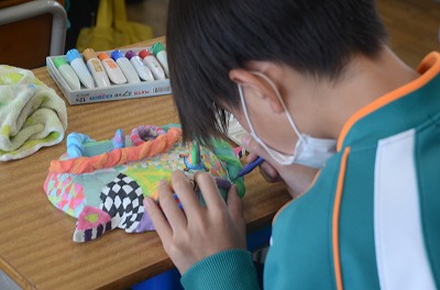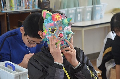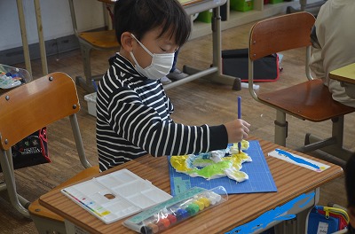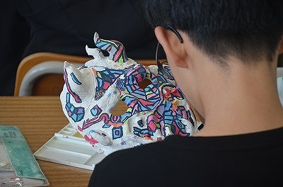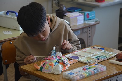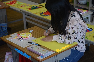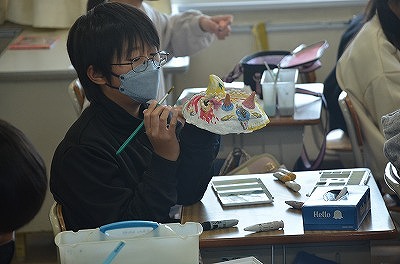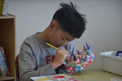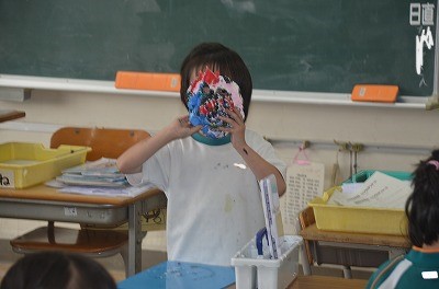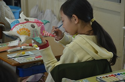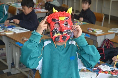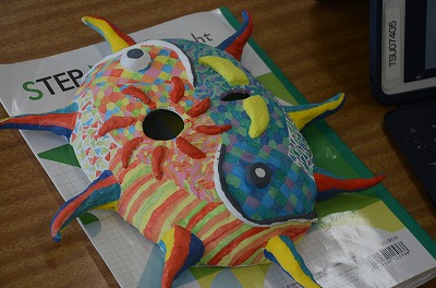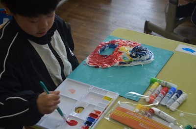 どの子もとても大切そうに一筆一筆色を重ねていっています。お面がとても素敵ですね。