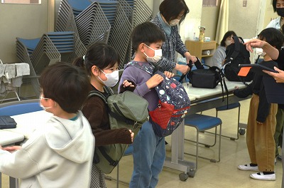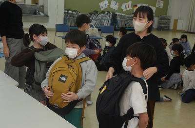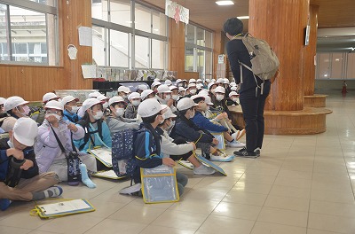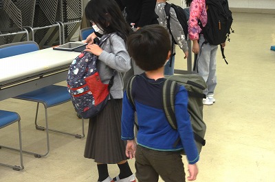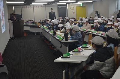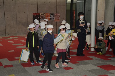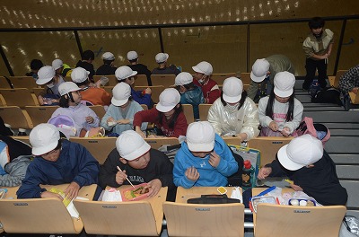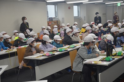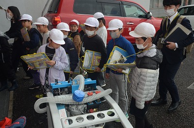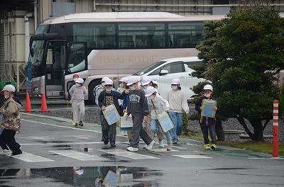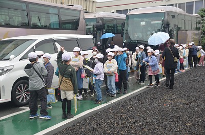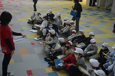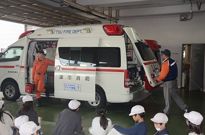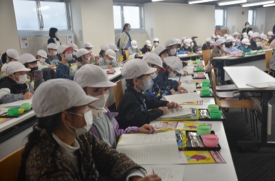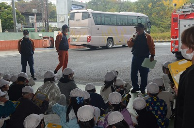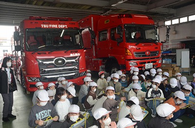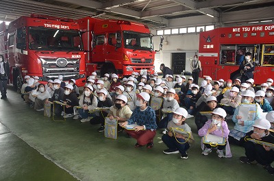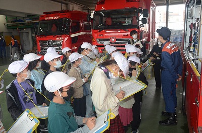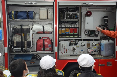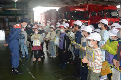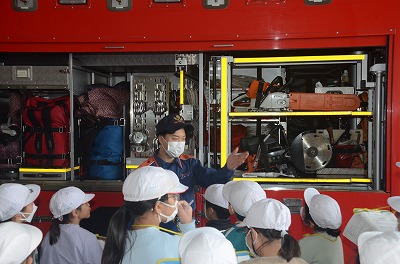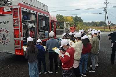 最後の見学地は消防署です。ここでは3つのグループに分かれ、各消防車の説明を聞かせていただいたり、機材を見せていただいたりしました。子どもたちは一生けん命、栞に書き込んでいました。