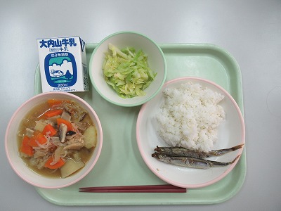 麦飯、焼きししゃも、ジャガイモのそぼろ煮、香味漬け、牛乳
