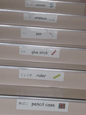 本校の階段には様々な言葉が英語で表示されています。