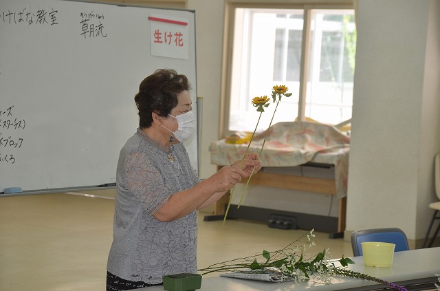 ふれあいホールでは「生け花教室」が行われました。講師の先生やスタッフの方に教えてもらいながら、慎重にたくさんのお花を生けていきました。