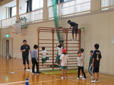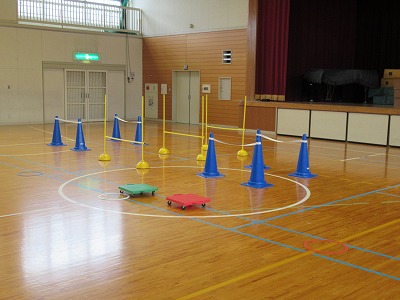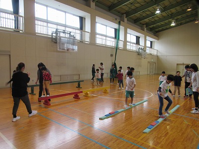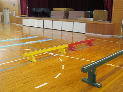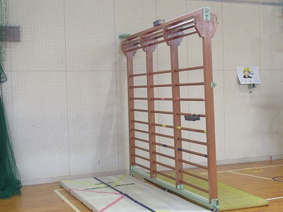 今日の時間に体育館に用意されたのは「忍者登り(ろくぼく登り)」「くぐる」「橋渡り(平均台)」です。
