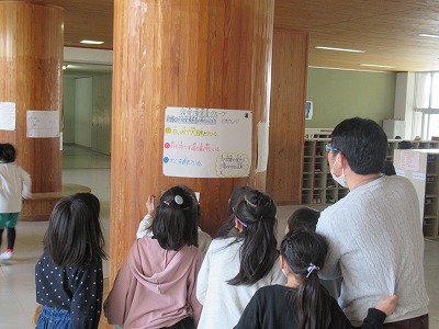 低学年の子どもたちが校内に貼りだされているクイズをめぐって、ラリーに挑戦していました。