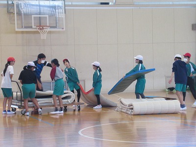 2限目に中学校と合同で避難訓練を行いました。避難の指示が入ると子どもたちは口を押え、姿勢を低くし、しゃべらずに速やかに非難ができました。来ていただいた消防署の方からも後から「子どもたちの避難するときや待っている時の姿にびっくりしました。」とお褒めの言葉をいただきました。