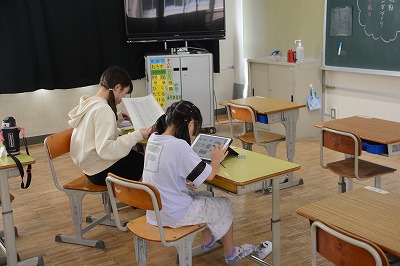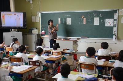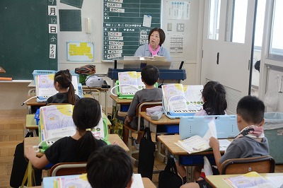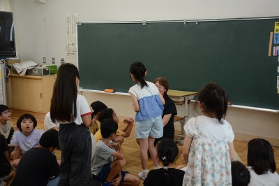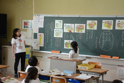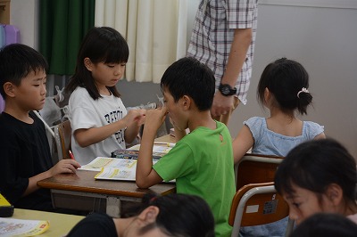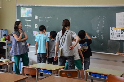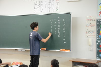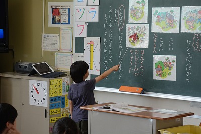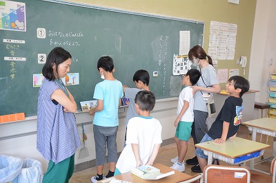 黒板に貼ってある物語の絵を順番に並べかえているところです。