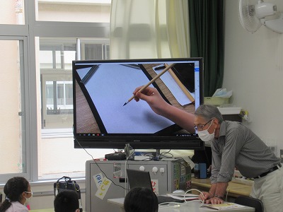 これは3年生の習字ですね。「筆の使い始めは、指で柔らかくほぐすようにします。」「そして、筆はこのように立ててつかいます。」テレビに映像を映し、視覚的にも理解しやすいようにしているんですね。