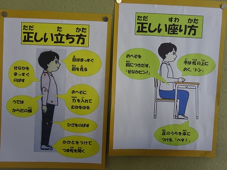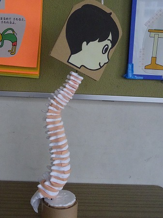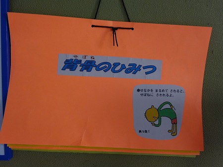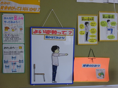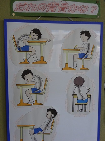 姿勢の問題は学校と家庭が協力しなければ解決できないことです。学校では本を読むとき、字を書くとき、気を付けてはいるのですが、やはりいつの間にか背骨が曲がり、机に目を近づけて字を書くという光景が見られます。背筋を伸ばすのは学習のためだけではありません。生涯にわたって健康な生活を続けていくための基本です。保健室では掲示板の半分に、このことについて啓発しています。背骨の模型を用意したり、「背骨のひみつ」という表紙に隠された資料を掲示したりして、子ども達の関心を誘おうという作戦です。