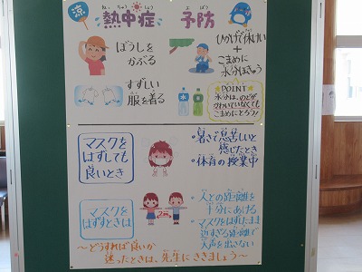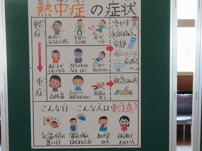 7月に入ってから蒸し暑い日が続いています。そこで、2人の養護教諭が熱中症予防のために気をつけることを子どもたちにわかりやすくまとめました。児童用玄関に掲示してあります。