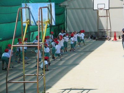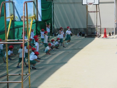 1年生の体育の時間で準備体操でやっていました。「ジャンケンぽん」と、運動場に響き渡るような声とともに、全身を使って何回も何回も繰り返していました。子どもたちは勝てば両手を挙げて大喜びです。