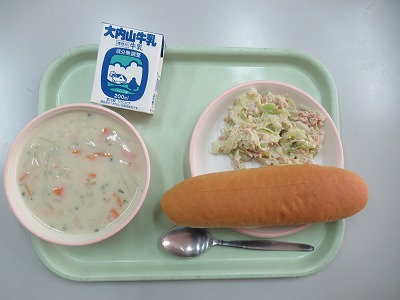 ツナサンド、ジャガイモ豆乳ポタージュ、牛乳