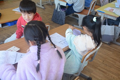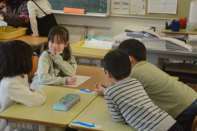 来年1年生に入学してくる子どもたちにクイズを考えていました。「ヒント①丸いものです。ヒント②遊ぶときに使うものです。ヒント③はねます」など。