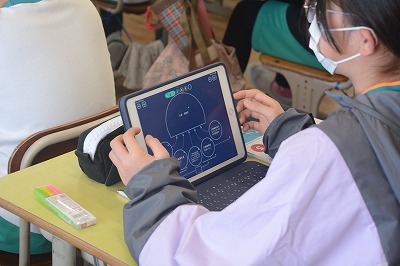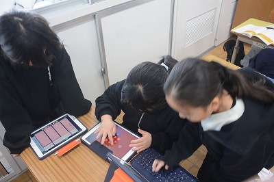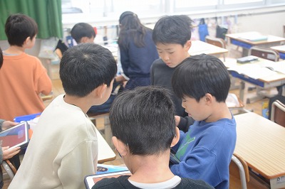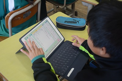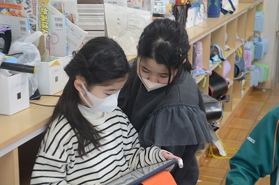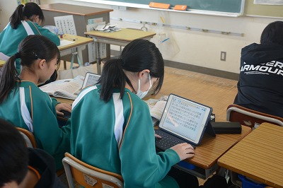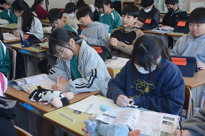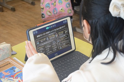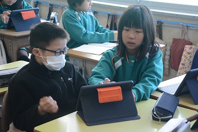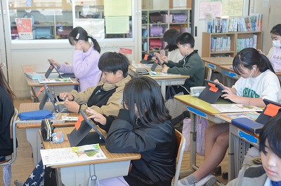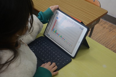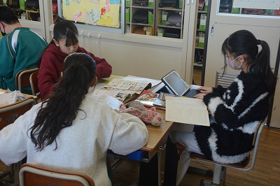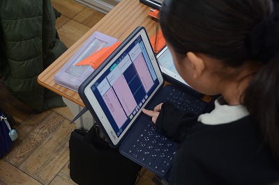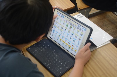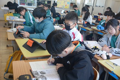 教科書や資料で調べたものをタブレット端末を使ってまとめていました。