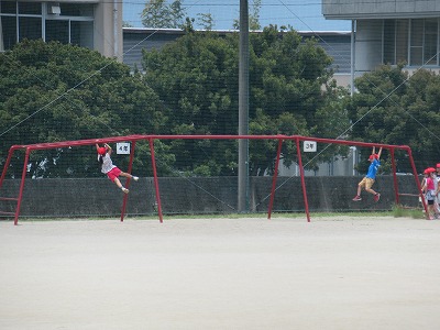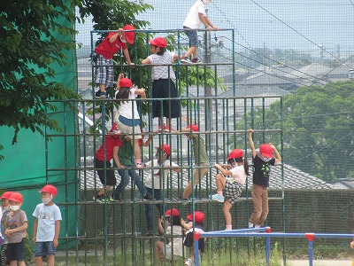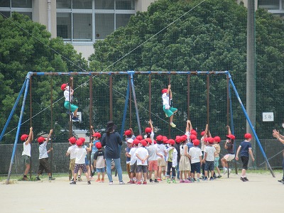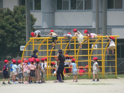 1年生も学校生活にずいぶん慣れてきました。今日は運動場にある遊具の使い方の学習で楽しんでいました。