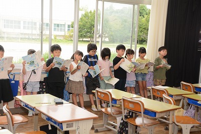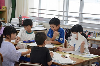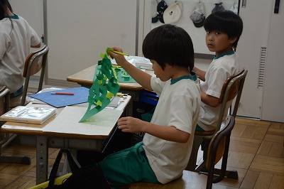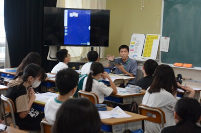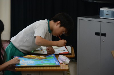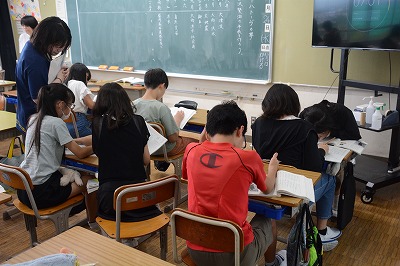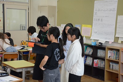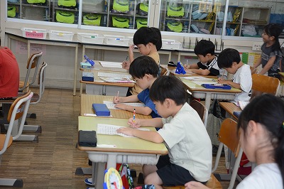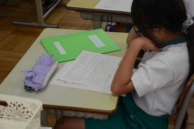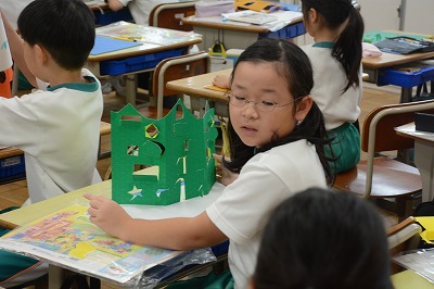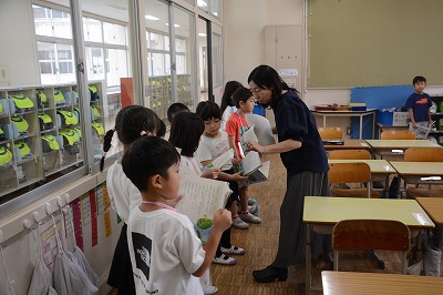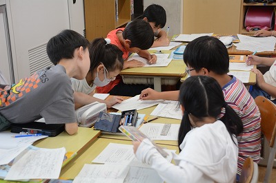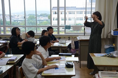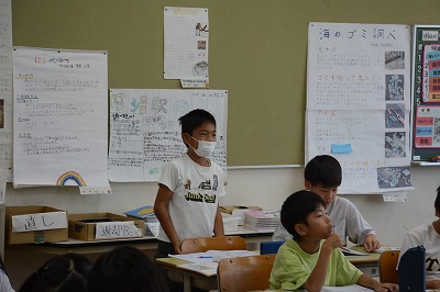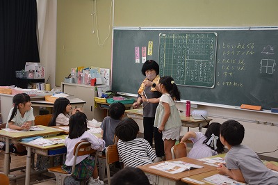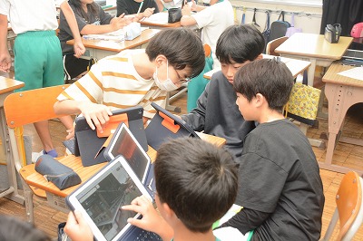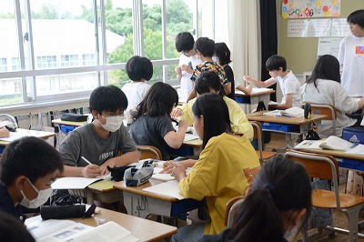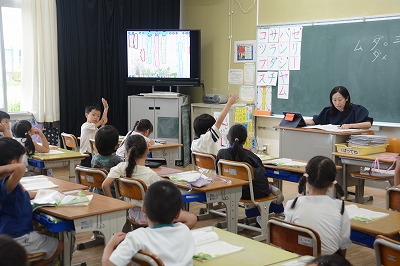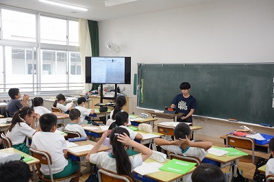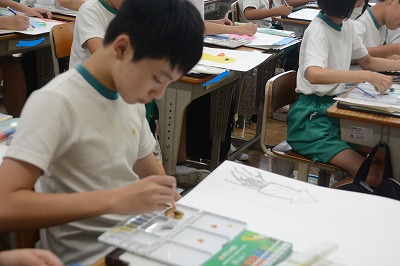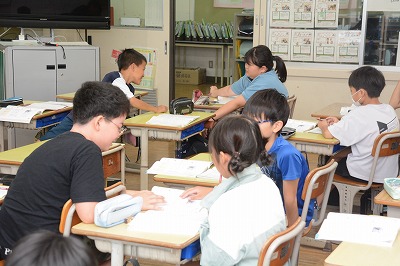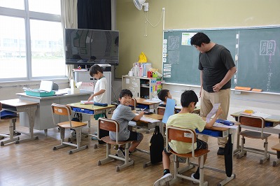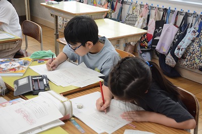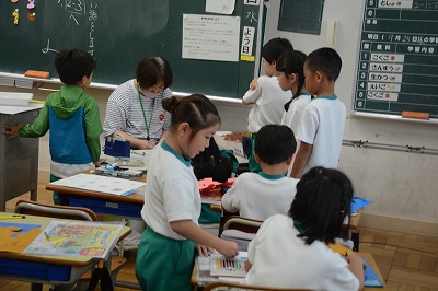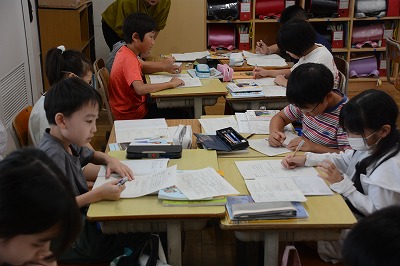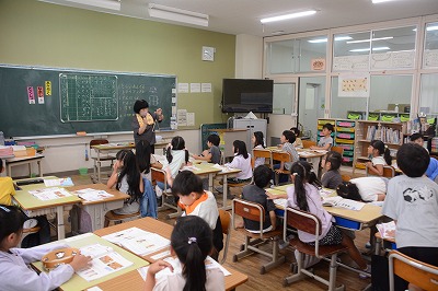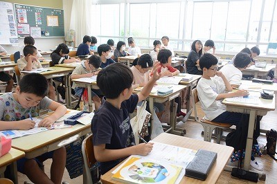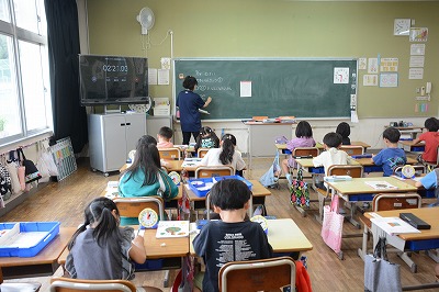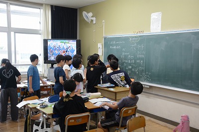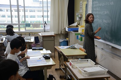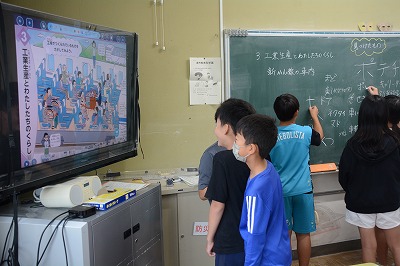 教科書の挿絵の中から工業製品を探して黒板に書いていました。