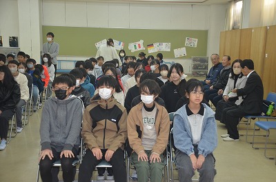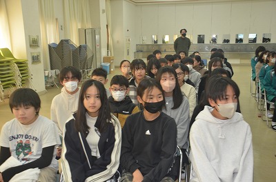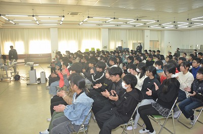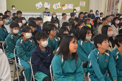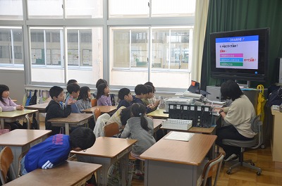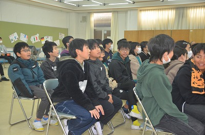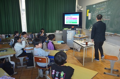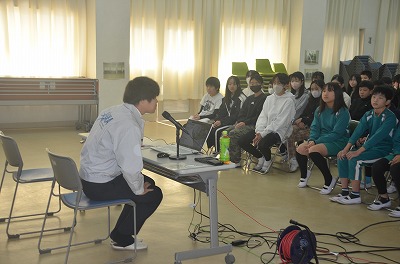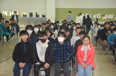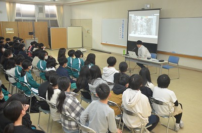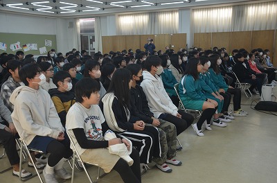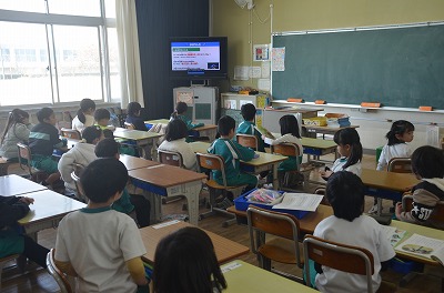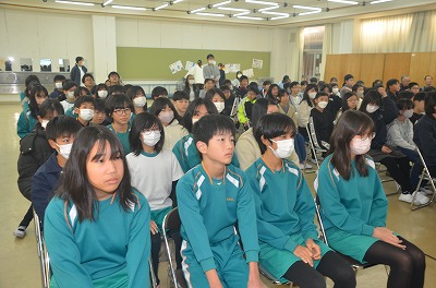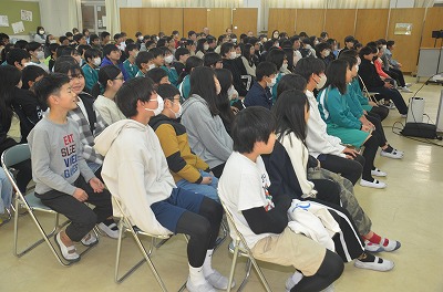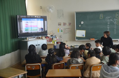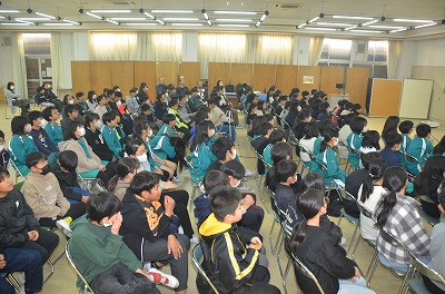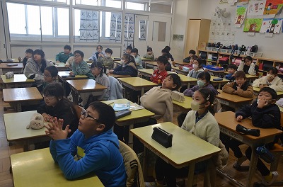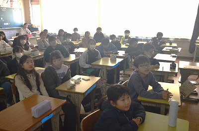 6年生はふれあいホールで、1~5年生は各教室でオンラインでお話を聞かせていただきました。
