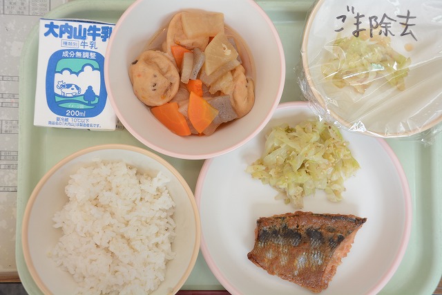 【給食】ご飯 牛乳 さけ 煮物 浅漬