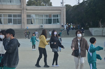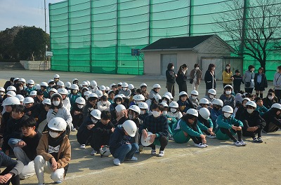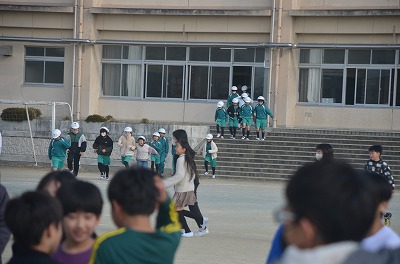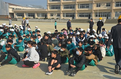 2限目に中学校と合同で避難訓練を行いました。避難の指示が入ると子どもたちは口を押え、姿勢を低くし、しゃべらずに速やかに非難ができました。来ていただいた消防署の方からも後から「子どもたちの避難するときや待っている時の姿にびっくりしました。」とお褒めの言葉をいただきました。
