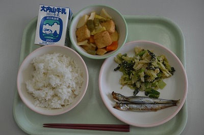 ご飯 春野菜の煮物 ししゃも 牛乳 やさいのごま和え