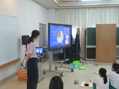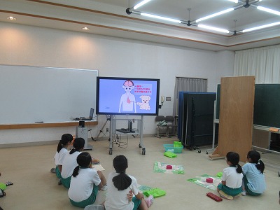 2学期最初の委員会活動の日に、保健委員会では、救命に関する講習を行いました。 ビデオで学びながら、簡易のキットを使って、胸骨圧迫とAEDの実習です。 もしも倒れている人がいたときに、何もしないのが一番ダメなこと。 ビデオで、やさしく丁寧に解説をしてくれます。