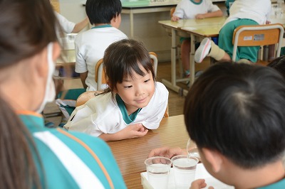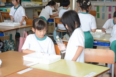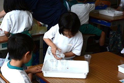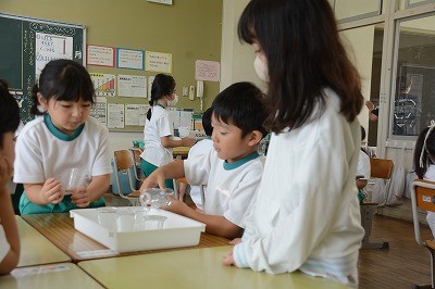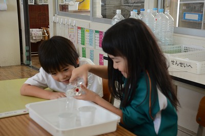 水を使って実際にどちらが多いか確かめました。実体験による学習は子どもたちの目が違います。みんないい目をしています。