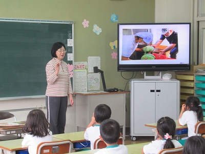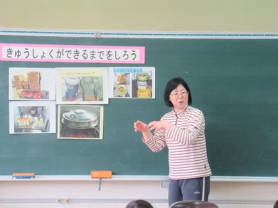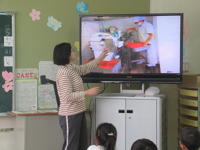 毎日の給食はどのように作られているのかな? 先生から、写真を見ながら、お話をしてもらいました。