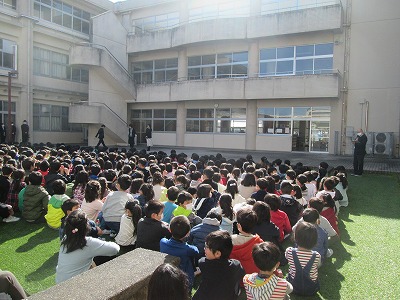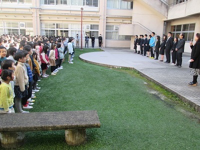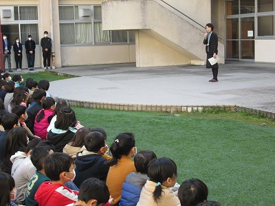 3月25日 中庭で時間を短くして、修了式・離任式を行いました。