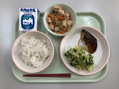 麦飯、サバの一味焼、キャベツと水菜の浅漬け、高野豆腐の煮物、牛乳