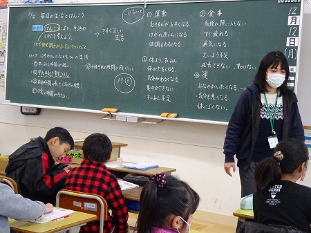 保健の時間です。今日は健康によい生活の仕方を考えました。生活の場面を「運動」「休養・睡眠」「食事」「便」の4つにしぼり、それぞれ生活にどんな効果があるか、おろそかにするとどんな影響が出るかを考え、話し合いました。ここ数年「早寝 早起き 朝ごはん」が合い言葉になっていますが、どれもが大切なことを今日確かめることができました。