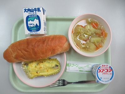 米粉入りパン、ホキのカップ焼き、カレースープ、ヨーグルト、牛乳