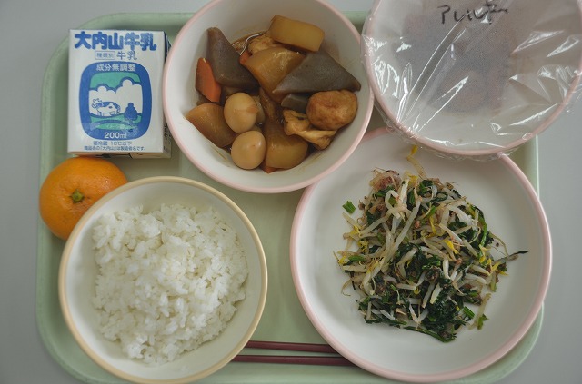 【給食】ご飯 牛乳 みそおでん おかかあえ みかん