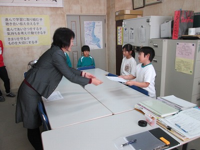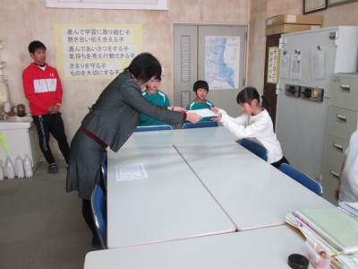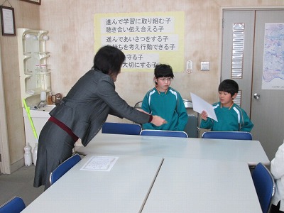 先の小中合同人権集会に参加できなかった低・中学年4名の児童の人権標語・ポスター入選表彰を校長室で行いました。校長先生から入選者一人一人に賞状が手渡しされました。おめでとうございます。