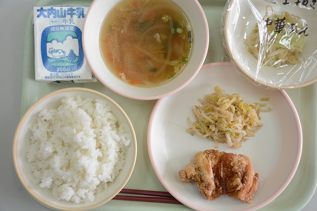 【給食】ご飯 牛乳 油淋鶏 中華あえ スープ
