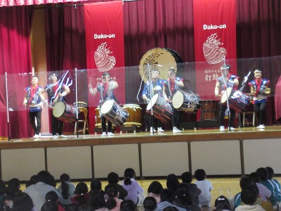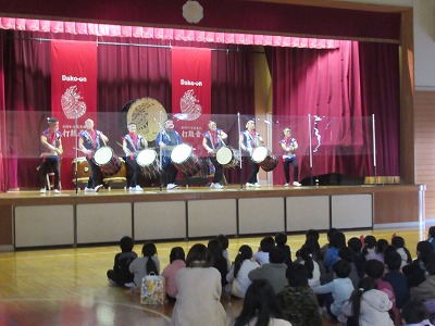 今日は創立30周年を記念しての芸術鑑賞会で、和太鼓の演奏を楽しみました。創作和太鼓集団「打鼓音(だこおん)」さんに来ていただき、体育館で2学年ずつ演奏を聞かせていただきました。