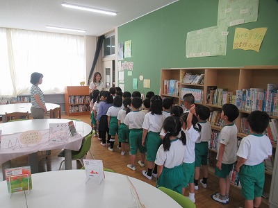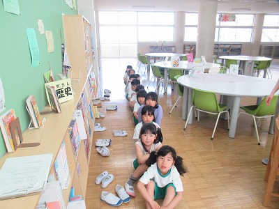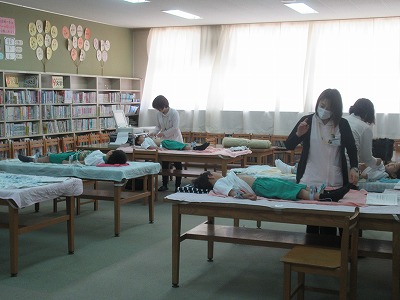 朝から1年生と4年生の心電図検査を図書室を使って行いました。