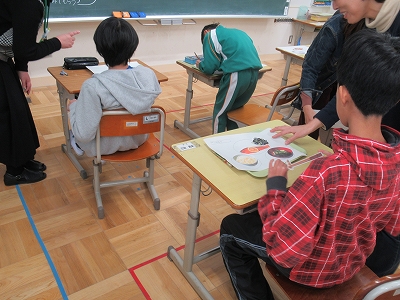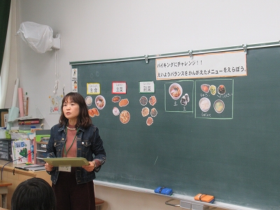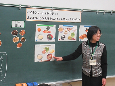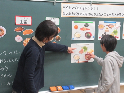 子どもたちは、黒板を見ながら「主菜はこれで…」 「主食はやはりこれかな」など楽しみつつも考えて 選んでいました。